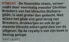 De wrange bijsmaak van deze 'solidariteitsactie' wordt pas later dat jaar duidelijk, als de declaratiefraude rond de posteractie aan het licht komt. Desalniettemin wordt een 'interne onderzoekscommissie' in het leven geroepen in die financiële gangen van de Gildemeester/uitgever moet nagaan. Hangende dit onderzoek wordt Breukers als lid geschorst en gevraagd terug te treden als Gildemeester.10 Eline Janssens, voorzitter van Stichting Utrecht Verdicht verklaarde desgevraagd: "In de afhandeling heeft het bestuur alle scenario's open gehouden, ook de juridische. Centraal staat voor ons een correcte financiële en administratieve afhandeling van de actie en minimale reputatieschade aan het gilde. Chrétien Breukers is geroyeerd als lid van Het Utrechts Dichtersgilde omdat hij, bij navraag van het bestuur, aanvankelijk onvolledige en onjuiste onderbouwingen van de door hem (in naam van De Contrabas) uitgevoerde posteractie heeft geleverd. Het bestuur en de leden zijn van mening dat Breukers niet heeft gehandeld in het belang van het gilde en de schijn heeft gewekt het gilde moedwillig te benadelen. Het vertrouwen is te zeer geschaad. Daarom was royement onafwendbaar. Een juridische gang zou niet verder bijdragen aan het eindresultaat."13 Dat de drukker die het Gildedrukwerk uitvoerde nog steeds niet betaald is, interesseert de Stichting en de Utrechtse Gildeleden niet. Eline Janssens: Gildedichter in de ban