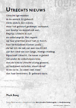 Breukers declareert ook de vormgevingskosten, à € 950,-. Hoewel hij de bijbehorende factuur noch betalingsbewijs kan tonen, vergoedt Stichting Utrecht Verdicht deze declaratie.8 Op 30 januari 2014, voert het Utrechts Dichtersgilde 'actie' in Utrecht. De poëzieposters en ansichten worden verspreid. Jeroen Wielaert doet voor NOS Radio 1-journaal verslag8a: