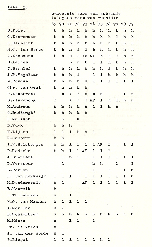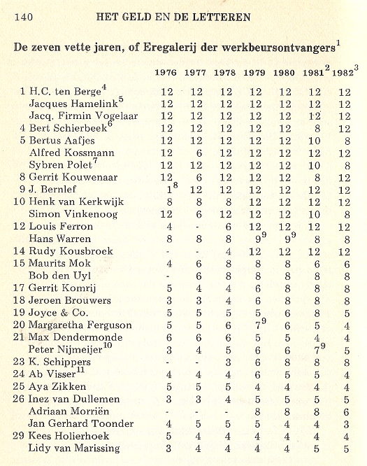 Deze scriptie is overigens alweer een jaar oud, maar pas onlangs kwam ze in de openbaarheid door middel van artikel in "Het Parool". Vervolgens werd door PvdA-kamerleden opening van zaken gevraagd aan minister De Boer van CRM. Het antwoord daarop hebben we nog niet gezien. Voor subsidie aan letterkundigen staat elk jaar zo'n 3,5 miljoen op de rijksbegroting. Daarvan worden beurzen toegekend, die de auteurs in staat stellen zich geheel aan hun kunst te wijden, zodat ze niet verplicht zijn hun romans of gedichten te schrijven in de tijd die overblijft nadat ze voor hun onderhoud hebben gezorgd. Maar weinig schrijvers zijn namelijk zo succesvol, dat ze van de opbrengst van hun boeken kunnen leven, en dat geldt zeker van de auteurs van moderne literatuur.