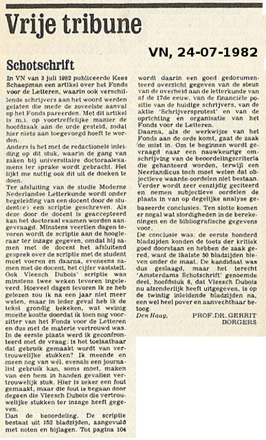 Overigens is de publikatie van een en ander ook niet uit pure objectiviteit gebeurd. De schrijver van het artikel in "Het Parool" was namelijk een dergenen die jaar op jaar bij het Fondsbestuur bot vingen met hun aanvragen. Zo iemand komt natuurlijk heel gemakkelijk tot de overtuiging dat het geld naar de verkeerden gaat. Daarbij zal ook de vraag aan de orde moeten komen of inderdaad de verdeling van dat geld kan worden toevertrouwd aan mensen die zelf allerlei persoonlijke banden met aanvragers hebben. Weliswaar wordt de samenstelling om de twee jaar gedeeltelijk ververst en zit niemand langer dan vijf jaar, maar er kan toch gemakkelijk een soort inteelt optreden. Maar dank zij de socialistische nivelleringspolitiek is deze bron praktisch opgedroogd. In die zin is het logisch dat de staat de ondersteuning van de kunst overneemt. Maar ideaal is het zeker niet. Men hoeft dit element niet voor de volle 100 pet. te ontkennen om toch afstand te nemen van het vrijheidsbegrip dat hierachter ligt. Want in deze zienswijze geeft een mens er pas blijk van echt vrij te zijn, als hij kiest voor de socialistische maatschappij van de toekomst. Maar voor die keuze kan hij evengoed gemanipuleerd worden, bijvoorbeeld door profeten die hem schone dromen voorspiegelen die helemaal niet uitkomen. De consequente marxist gaat zelfs zover, dat hij de mensen pas echt vrij acht als ze alleen nog maar kunnen kiezen wat hij goed voor hen vindt. De conclusie van prof. Van het Reve was, dat een Nederlandse politieke partij en een Nederlandse regering geen oordeel over die keuze van de mensen behoort te hebben en niet op middelen moet zinnen om die te veranderen. Zo kras zouden wij het niet willen formuleren, want dit klinkt ons toch wel al te vrijblijvend in de oren. De overheid zal echter een kunstbeleid moeten voeren binnen de bevoegdheden die haar toekomen, en die zijn slechts bescheiden. Vooral in de niet-politieke sfeer, die van gezin, school en krant, zal de goede smaak voor kunst bevorderd moeten worden en zal geleerd moeten worden ook in deze dingen de geesten te beproeven. Nederlands Dagblad, 07-07-1982 Minister De Boer steunt Fonds voor de letteren (van onze politieke redactie) [fragmenten] DEN HAAG - Er is geen sprake van een geheim CRM-dossier, waaruit zou blijken dat net Fonds voor de Letteren van 1973 tot 1976 een beperkte kring van steeds weer dezelfde schrijvers heeft gesteund. Ook is in die jaren en daarna (op basis van een nieuwe regeling) door het bestuur van het Fonds steeds zorgvuldig en met inachtneming van een zo groot mogelijke objectiviteit gehandeld en beoordeeld. Dit schrijft minister H.A. de Boer (cultuur, recreatie en maatschappelijk werk) in zijn antwoord op schriftelijke vragen van de PvdA-Tweede-Kamerleden A. Kosto en F. Niessen. Minister de Boer ontkent in zijn antwoorden niet, dat schrijvers, die al eerder een werkbeurs kregen, vaker een nieuwe bijdrage krijgen dan eerste aanvragers. Maar hij noemt dat voor de hand liggend, omdat "de kwaliteit bij de groep die al eerder op grond van een kwaliteitsoordeel een uitkering kreeg gemiddeld hoger is dan bij de ongeselecteerde groep eerste aanvragers". (...) Een beslissing wordt alleen genomen op basis van een werkplan, aldus minister De Boer. Bij het niet voltooien van het werkplan hoeft het geld niet te worden teruggestort. Minister De Boer acht dat terecht. (...) (...) De bewindsman heeft inmiddels de Universiteit van Amsterdam om inzage gevraagd van de scriptie van drs. P. Vleesch Dubois over het subsidiebeleid van het Fonds voor de Letteren. Hij wil nakijken of een onlangs in Het Parool verschenen artikel over dit onderzoek wel klopt. De minister schrijft de faculteit, dat hij een eventuele weigering om de scriptie op te sturen, hoog op zal nemen. Bron: http://resolver.kb.nl/resolve?urn=ddd:010627807:mpeg21:a0073