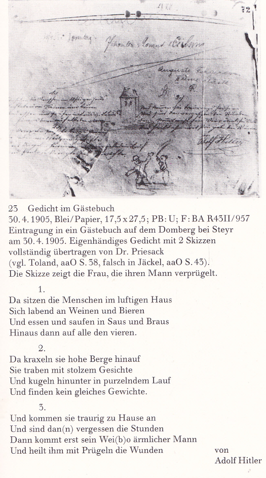 Waar hij deze wijsheid vandaan heeft? Het lijkt er op dat hij het gedicht bij Jäckel - de enige bron die hij in deze noemt - gevonden heeft, en de opmerkingen over het 'frêle mannetje' en de 'fors beboezemde vrouw' bij Keller heeft gelezen. Alleen: Keller opperde dat de vrouw op de tekening wellicht Petronella Cichini was, Hitlers hospita - niét de eigenaresse van het hotel. Meer verzinsels