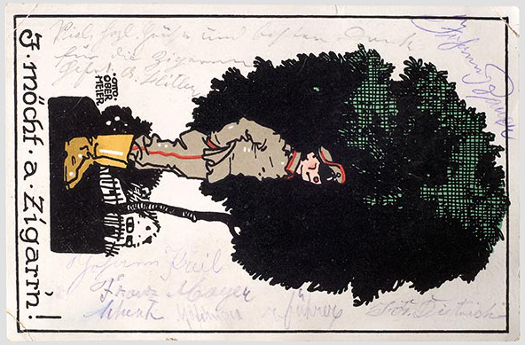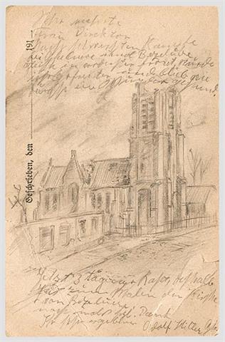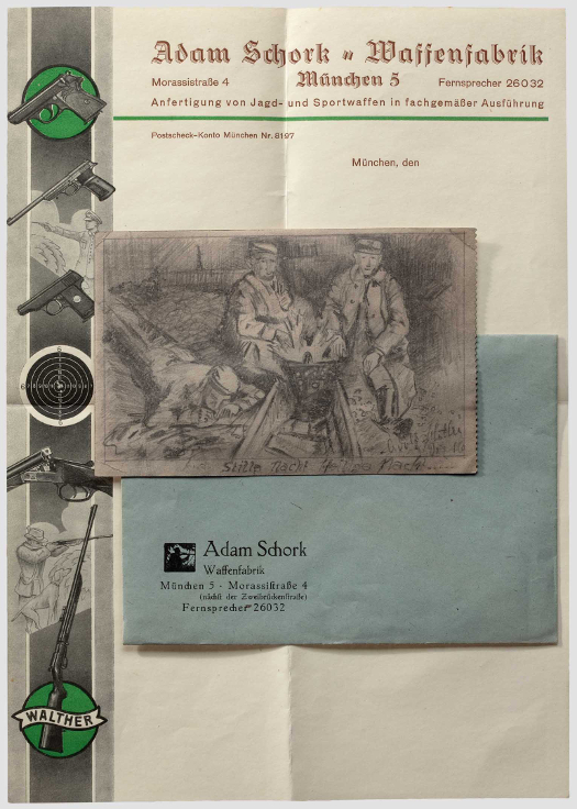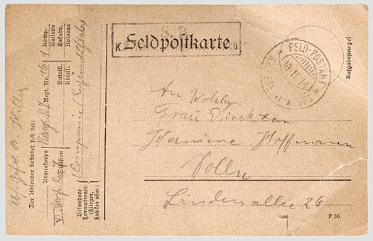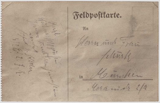 Deze kaart, met lotnummer 7277 zou voor 30.000 (!) euro verkocht zijn op Auktion 54r, 16/17 april 2008, bij veilinghuis Hermann Historica te München. De startprijs was 6500 euro. Het is een platte vervalsing. 2. Ansichtkaart 'uit 1915'