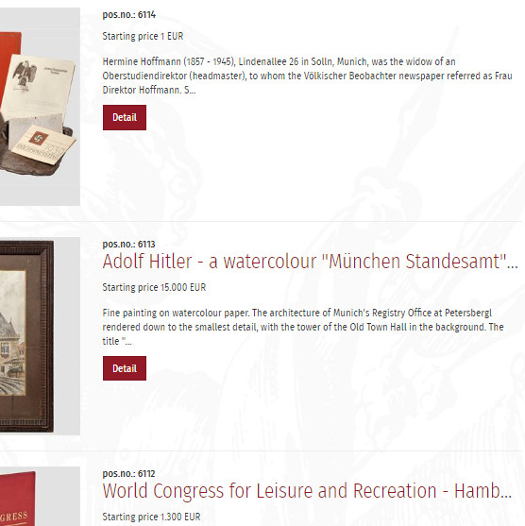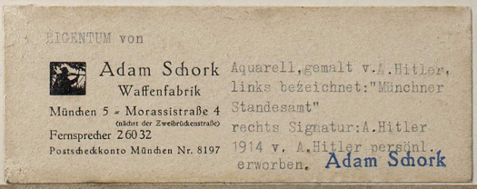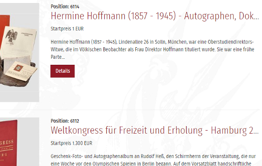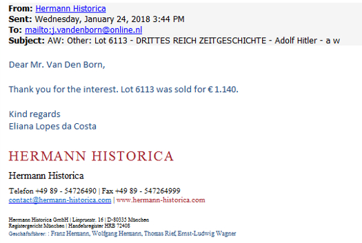 Deze kaart, met lotnummer 7278 is voor een onbekend bedrag verkocht op Auktion 54r, 16/17 april 2008, bij veilinghuis Hermann Historica te München. De startprijs was 1200 euro. Ook dit is een platte vervalsing - dat heet: de ansichtkaart zelf is mogelijk origineel; de handschriften zijn door vervalsers aangebracht. 'Gesigneerde' Hitlerfoto