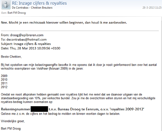 Voor dat jaar, 2011 dus, hadden hij en Jan Pollet € 18.000,- gekregen voor werkzaamheden aan De Contrabas. Zodra het geld binnen was, werd Pollet uit De Contrabas gezet. Vervolgens huurde Breukers Willem Thies en mij in, voor een jaar. Waarom, vraag ik me nu af - want hij had toch kunnen voorzien dat hij ons niet voor een jaar zou kunnen betalen? Maar ook dit terzijde.