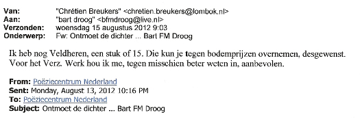 Het klopt dat ik - in 2008 - een werkbeurs had aangevraagd voor m'n in 2009 bij de Contrabas te verschijnen bundel Veldheer. Zowel ik als het Fonds voor de Letteren (zoals Nederlandse Letterenfonds destijds heette), verkeerden toen in de veronderstelling dat De Contrabas een normale, reguliere uitgeverij zou zijn. Het klopt ook dat die werkbeursaanvraag toen afgewezen werd – het hele werkbeurzensysteem was en is vooral een loterij. Misschien is het waar dat Veldheer - let wel: door Breukers zélf geredigeerd en op diens uitnodiging bij De Contrabas verschenen - slecht verkocht heeft. Maar misschien is het ook niet waar: Breukers antwoordde me dit, toen ik hem begin 2013 naar de verkoopcijfers vroeg: ![]() Vele andere dichters uit het Contrabasfonds kregen soortgelijke antwoorden op hun vragen naar verkoopcijfers en royalty's. Maar misschien was er wel hetzelfde aan de hand als met de latere Contrabasbundel van Nina Werkman (zie Meander, 8 januari 2015), met twee verschillen: ik hoefde geen 'aanbetaling' te doen én Breukers had tenminste enige exemplaren 'op voorraad'. Wat ook te denken geeft is dat Breukers nog op 15 augustus 2012, twee maanden nadat ik met hem gebroken had, me aanbood mijn 'Verzamelde gedichten' (in Breukers' mail als 'Verz. Werk' omschreven) uit te brengen. Dat aanbod deed hij, nadat hij een aankondiging van een optreden van mij in het Poëziecentrum Nederland had ontvangen: ![]() Waarom zou hij dat gedaan hebben, als Veldheer inderdaad zo slecht had verkocht? Maar goed – ook dit terzijde. Breukers:
