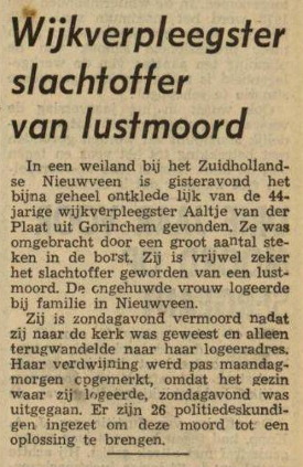 De brommer werd teruggevonden in het Sterrebos te Groningen, niet ver van de Van Mesdagkliniek. Al voor de ontdekking van het lichaam meldde een regelmatige wandelaar bij de politie dat in dat park al een paar dagen een brommer met een helm op de zitting stond. De politie ging kijken en stalde de brommer bij het bureau. Nadat het lichaam van Sasja is gevonden en bekend wordt dat haar brommer verdwenen is, vindt de politie in de systemen dit incident. Dan wordt Rien, Sasja's vriend, gevraagd of deze brommer zijn brommer is. Ja, maar de helm is niet van hem, is zijn antwoord. De halfbroer van Sasja zegt dat een soortgelijke jas en helm wel eens bij hem thuis hebben gelegen, maar hij weet niet of dat ook het geval was op de dag dat Sasja verdween. Niemand op het adres van Rien blijkt Sasja die dag te hebben gezien. Het blijft daardoor een raadsel hoe Sasja aan de jas en helm is gekomen. Nog twee zaken Een paar dagen later wordt op de plek waar de kleding is gevonden een duikteam ingezet. Op tien meter afstand vinden ze op de bodem een vuilniszak. Bij het uit het water halen, valt er iets uit de zak. In de zak zitten een jas, een paar schoenen, make-up, sokken en een trui. Omdat men graag wil weten wat er uit de zak gevallen is, wordt er een paar dagen later opnieuw een duikactie gehouden. Op vijfentwintig meter afstand vindt men een jas, waarvan de mouwen zijn dichtgeknoopt. Men vindt in de jaszakken twee basaltkeien en een condoom. Vrijdagmorgen 4 november 1993, rond half acht 's ochtends. Een jager speurt vanaf een smalle bestemmingsweg in de sloten tussen Enumatil en Zuidhorn naar eenden. Tot zijn verbazing ziet hij een vrouw voorover in het water liggen. Ze is naakt, haar lichaam bevindt zich grotendeels onder water en ze beweegt niet meer. Op haar achterwerk zit een bruinachtige vlek die lijkt op een schoenafdruk, alsof iemand haar met de voet onder water heeft proberen te duwen. De Technische Recherche gaat aan het werk. Men heeft geen idee om wie het gaat, want nergens liggen voorwerpen die iets over haar identiteit kunnen zeggen. Advertentie. Nieuwsblad van het Noorden, 13 november 1993 Mischa woonde bij een andere vriend, Hans, een postbode, die tot over zijn oren verliefd op haar was. Daarnaast had zij nog omgang met Lammert, aan wie zij had verteld dat zij uit het wereldje wilde stappen en wilde stoppen met het druggebruik. Deze Lammert richtte ten tijde van de moord een huis voor hen in. Kortom, een bekend verhaal in deze wereld. Het leek erop dat Mischa meerdere mannen om haar vinger wond. Een paar dagen na de moord op Fatol vonden vissers in het Winschoterdiep, aan de oostkant van Groningen, een vuilniszak met kleding en een handtas. De tas en de kleding waren van haar, er ontbraken echter een laars en een jas. In het onderzoek naar de moord in 1993 wordt Rien korte tijd als verdachte aangemerkt. Dat gebeurt nadat er een tip was binnengekomen over een poging van hem om juwelen van haar te verkopen. Bovendien blijkt dat hij vanaf de plek waar hij die donderdagavond stond geparkeerd nooit het door hem genoemd stoplicht heeft kunnen zien, waar de Opel Ascona rechtsaf zou zijn geslagen. Tijdens de verhoren was hij echter blijven ontkennen. En omdat het onderzoek tegen hem niets had opgeleverd, was de verdenking tegen hem komen te vervallen en moest men hem vrijlaten. Aangezien het politieonderzoek ook geen andere verdachte had opgeleverd, werd het onderzoek gestopt en belandde het dossier op de plank. Annelise Reinders werd op 21 januari 1995 gevonden. Een schipper had de politie gemeld dat hij in het Eemskanaal, vlak voor Appingedam een lijk had zien drijven. De politie ging erheen en vond in het water inderdaad het voorover liggende naakte lichaam van een jonge vrouw. Om haar hoofd en hals zat een touw dat, via een ingewikkelde constructie, ook om haar polsen en enkels was gebonden. Haar rug was bedekt met een dikke laag groene algen. Dit betekent dat het lijk al enige tijd in het water moet hebben gelegen. Kleding wordt niet gevonden. Op het politiebureau wordt gekeken welke jonge vrouwen er al enige tijd vermist worden en zo stuit men op de eenendertigjarige Annelise Reinders, een tippelaarster die sinds zondag 11 december 1994 vermist is. Advertentie. Nieuwsblad van het Noorden, 28 januari 1995 Men neemt op grond van het technisch onderzoek aan dat het lichaam van Annelise enige tijd door iets is vastgehouden. De stroming in het Eemskanaal is namelijk zo sterk dat zij intussen op de Noordzee had moeten drijven. Ook deze zaak werd niet opgelost. Door de vondst van de kledingstukken van Fatol en Reinders in de plastic zakken in het Slochterdiep, dicht bij de plaats waar Sasja Schenker is gevonden, ontstaat in het team een opgewonden stemming. We hebben hoogstwaarschijnlijk niet met één zaak, maar met drie zaken te maken. En die zijn waarschijnlijk door één en dezelfde dader gepleegd. Het is voor Geert Nieuwenhuis in elk geval een reden om mij definitief bij het team te betrekken. Ik weet veel van de oude zaken af en een psycholoog kan nuttig zijn bij het verhoor van een seriemoordenaar. In het team zetten we eerst de overeenkomsten in de drie zaken op een rijtje: de slachtoffers zijn tippelaarsters, zij worden voorover liggend en naakt in water aangetroffen, een gedeelte van de kleding wordt vlak bij elkaar in het Slochterdiep aangetroffen, de doodsoorzaak is verwurging met de handen, er zijn weinig of geen andere verwondingen, er zijn vuilniszakken gebruikt, die doorgeprikt zijn en met basaltkeien waren verzwaard, keien afkomstig uit de beschoeiing van de roeibaan. We besloten om ons in eerste instantie alleen op de zaak Schenker te richten. Nadat we deze zaak opgelost hadden, zouden we de andere zaken erbij betrekken. We begonnen met te kijken wat we over het slachtoffer te weten konden komen. Er werd nagegaan waar Sasja voorafgaande aan haar dood was geweest. Dit leverde het volgende beeld op. Woensdagavond en nacht is zij op de baan aan de Bornholmstraat. Een getuige me