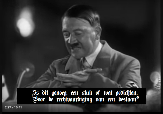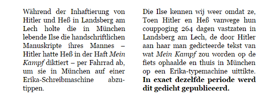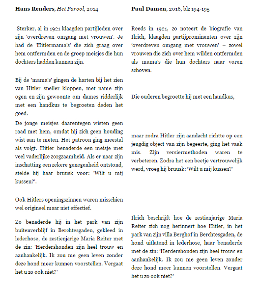 Links de Wikipediatekst, rechts de versie van Damen Adolf Hitler en Rudolf Hess zaten inderdaad enige tijd samen gevangen in Landsberg - in 1924, na de Bürgerbraukellerputsch van 8/9 november 1923. Hitler tikte daar Mein Kampf uit. Op een typemachine die hij met toestemming van de gevangenisdirectie in zijn cel had laten bezorgen. Ilse – eerst in 1927 gehuwd met Hess – kwam soms in de gevangenis op bezoek. Ze was in 1924 op geen enkele wijze betrokken bij het uittikken van Hitlers boek. Noch in de gevangenis, noch in München. Om het nog vreemder te maken: eerst betoogt Damen uitvoerig dat Hitler zijn Muttergedicht op 14 mei 1923 publiceerde - bijna zes maanden vóór de novemberputsch. En nu, nog op dezelfde bladzijde in zijn boek, is het opeens: ergens in 1924. Meer plagiaat Terug naar Mutti – er bestaat geen enkele twijfel over de werkelijke auteur van het Muttergedicht. Als hij dat na 'tien jaar onderzoek' nog niet ontdekt heeft is dat al genoeg reden het boek af te serveren. Het witwassen van het plagiaat Maar hij gaat veel verder. Een groot deel van zijn boek bestaat uit vertaalplagiaat, dat hij op een brutale wijze heeft witgewassen. Zijn werkwijze was simpel: hij vertaalde bestaande Engelse vertalingen één-op-één en legde die vertalingen als eigen werk voor aan een kenner, die hij vervolgens achterin zijn boek bedankte voor de hulp. Of hij bedankte mensen puur om hun naam te laten vallen: Hafid Bouazza (bedankt voor zijn hulp bij Arabische vertalingen) verklaarde ons geen noemenswaardige hulp geboden te hebben. Met deze 'stempels van goedkeuring' hield hij zijn uitgevers, nawoordschrijver Menno Wigman, recensenten, journalisten en uiteindelijk het publiek voor de gek. Damen verklaarde dat zijn werk door historici en vertalers was nagekeken, die ingehuurd zouden zijn door de uitgeverij. Gezien de grote hoeveelheid fouten en blunders in het boek en het massale plagiaat is dat uiterst onwaarschijnlijk. We vroegen Bart Kraamer en Chris de Jong van uitgeverij Koppernik of deze bewering van Damen klopte. Ze lieten weten dat we het antwoord op die vraag 'elders moesten zoeken.' Vertalingen van één gedicht verschillen altijd Bron: David Reid Poetry Translations Prize, 2006 Als twee vertalingen van één gedicht sterk op elkaar lijken, dan kan je er gif op innemen dat een van de vertalers het werk van de ander geplagieerd heeft. Dat geldt niet alleen voor verschillende vertalingen van één gedicht naar één taal, maar ook voor vertalingen van één gedicht naar talen binnen dezelfde taalgroep, zoals het Nederlands en het Engels. Nergens in het boek meldt Damen dat hij bestaande vertalingen naar het Nederlands heeft bewerkt. Nergens noemt hij de echte bronnen voor zijn vertalingen. Integendeel: hij beweert alles zelf uit de oorspronkelijke taal vertaald te hebben en schimpt, zowel in het boek als in interviews, herhaaldelijk op eerdere vertalers. Een paar voorbeelden: "Een heleboel vertalingen, zoals die uit het Chinees van Mao, daar klopt geen kut van. Dus ik wilde liever alles zelf vertalen." Bij Stalins Georgische gedichten : "De Russische vertalers [maken] het helemaal bont." En vervolgens plagieert hij diezelfde vertalers. Precies zoals hij dat met het werk van serieuze historici deed. De grootste literaire zwendel van de afgelopen 25 jaar Paul Damens werkwijze is zó doorzichtig, dat het ons elke dag méér verbaast dat niemand eerder alarm heeft geslagen over dit bedrog. Het kan gerust de grootste literaire zwendel in het Nederlandse taalgebied van de afgelopen 25 jaar genoemd worden. Immers: het bedrog van Adriaan Venema met diens Schrijvers, uitgevers en hun collaboratie deed zich voor in 1988-1992. De uitgevers treft natuurlijk het verwijt dat ze het werk zonder enige controle op de markt gebracht hebben. Wat hen hiertoe gebracht heeft is een raadsel. Menno Wigman meldt intussen, na kennisneming van ons dossier, dat hij afziet van de voorgenomen opname van het door hem geschreven nawoord van Bloemen van het kwaad in zijn nieuwe essaybundel. Natuurlijk brachten we Trouw op de hoogte van onze bevindingen. De krant liep in de berichtgeving over de 'authentieke' Hitlergedichten voorop (en beweert nog steeds dat het om 100% echt materiaal gaat ). Dit deden we ruim elf maanden nadat de krant al door een van de schrijvers van dit artikel gewezen was op wie werkelijk het Mutti-gedicht had geschreven: Georg Runsky. Voormalige verzetskrant Trouw hield zich toen doofstom. De canard van het dagblad bleef onweersproken en vormde de aanzet voor de triomftocht van het boek. De reactie van Trouw-hoofdredacteur Cees van der Laan nu: "Vanwege de complexiteit van deze kwestie, het gegeven dat Trouw niet als speelbal wil fungeren in een verbale strijd over feiten en fictie en als krant tegelijkertijd recht wil doen aan de geschiedenis, wil ik mij eerst nader oriënteren. Ik zal onder andere deze kwestie door een deskundige laten uitzoeken. Dit zal enige tijd gaan vergen." Dat hadden ze beter eerder kunnen doen. De Hitler-de-dichter-mythe, die tot nu alleen op neonazisites rondwaarde, heeft dankzij het werk van Paul Damen en de gretige voedingsbodem die het vond in de kritiekloze vaderlandse pers, inmiddels vaste voet gevonden in ons lieve vaderland. Inmiddels is het eerste vertaalde Moedergedicht van Georg Runsky al opgedoken in ‘t Vijverblad, nieuwsbrief van woonzorgcentrum de Vijverhof. Met de vermelding van Paul Damen als vertaler. De naam van de dichter wordt niet genoemd. Dan moet het wel van Hitler zijn. Een becommentarieerde versie van het Hitler-hoofstuk, uitgebreid commentaar bij de volgens Paul Damen 'echte' (maar toch echt valse) Hitlerverzen, talloze bewijzen van Damens plagiaat en geblunder, alsmede een uitgebreide bronnenvermelding staan op: DROOG- tijdschrift voor diepgravende onderzoeks-journalistiek. Droog, onafhankelijk en ter zake. Over zaken uit heden en verleden die er toe doen of deden. Zaken die meer aandacht vragen dan in een artikel van een of twee papieren 