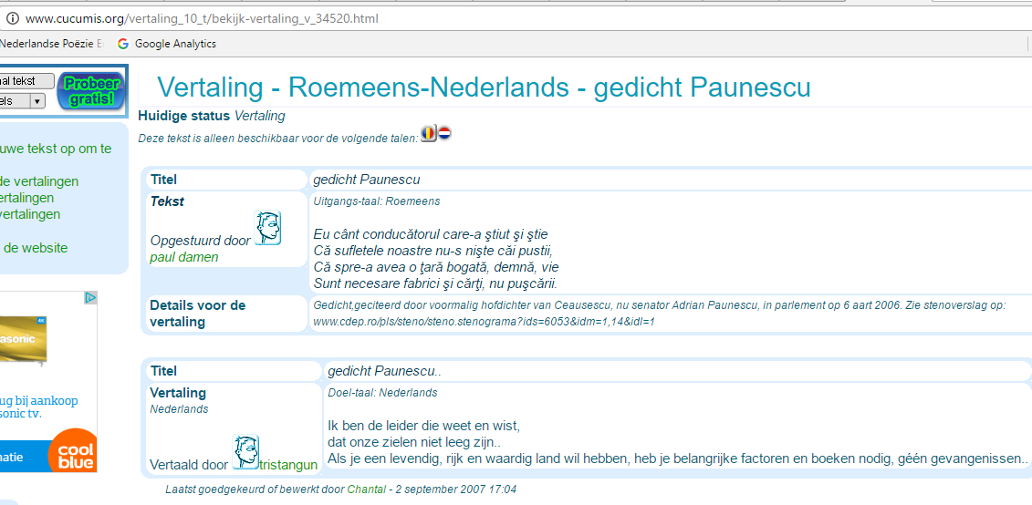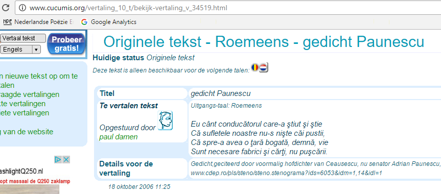 ___ | Bloemen van het kwaad versie 11-01-2017 | onderdeel van Bloemen van het Kwaad Paul Damen en het Roemeens ‘Ik wilde alles zelf doen, want die vertalers maken er vaak een potje van’ Paul Damen, VPRO Boeken, 24-04-2016. Op 18 oktober 2006 postte Paul Damen een Roemeenstalig vers van de dichter Adrian Paunescu op de online vertaaldienst Cucumis: www.cucumis.org/ Hij postte dat mét het verzoek of iemand dat vers naar het Nederlands wilde vertalen: |