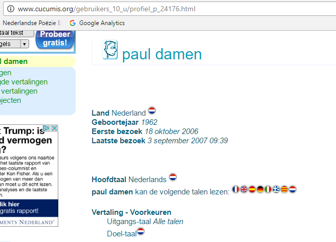 ___ | Hij maakte toen ook een profielpagina aan. Hij geeft aan Catalaans, Duits, Engels, Frans, Grieks, Italiaans en Spaans te kunnen lezen, en op zoek te zijn naar Nederlandse vertalingen: |