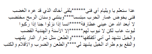 (-) Morgen, William, zult u ontdekken; welke jongeman tegenover uw broeders zal staan, die zijn misleid door hun leiders. Een jongeman, die in de rook van de oorlog ondergedompeld, bleef glimlachen; hij ging door op wat hem inviel, de bladen van lansen rood kleurend, Moge God mijn oog niet afhalen van de meest eminente mensen, als ze zouden vallen, moeten Djinns uitrijden, En leeuwen van de jungle, wier enige hoektanden; hun lansen en korte Indische zwaarden zijn Terwijl de hengst mijn getuige is dat ik hen inhoud, is mijn steken als de vuursintels die vlammend exploderen. Op de dag dat de hengsten uitrijden, zullen de strijdkreten mij bevestigen; net zoals steken, slaan, pennen en boeken. |