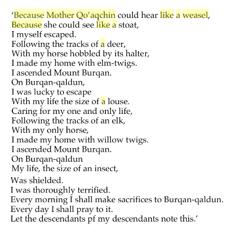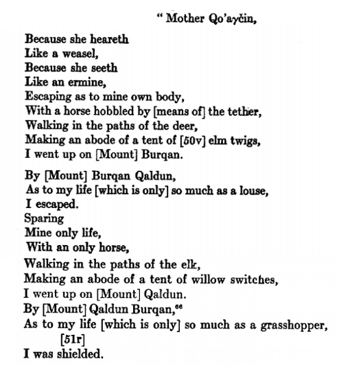 | ____ | ‘Because mother Qo’aqchin hears like a weasel and sees like an ermine, she saved my life. On the dotted tracks, I followed the deer trails. I made a yurt of willow. I climbed Burqan. On Burqan-qaldun, my life was like that of a louse. I managed to flee. My only life was spared. With only one horse I followed the elk trails. I made a yurt of twigs. I climbed Qaldun. On Qaldun-burqan, my life was like that of a swallow. I was protected.’ |