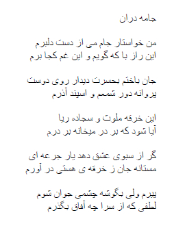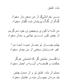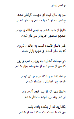 Koortsige ogen... O, mijn geliefde! Ik ben verslingerd aan de moedervlek op je lip! Ik zag je koortsige ogen, en werd zelf een patiënt! Ik ben buiten mezelf, op de trom slaand: ‘ik ben de Waarheid!’ En net zoals Mansur al-Hallaj geef ik me op voor de galg. Liefdesverdriet zette mijn ziel zo in vuur en vlam dat ik doodziek ben van mezelf, en de hele bazaar het weet. Gooi de cafédeuren dag en nacht voor mij open want ik ben de moskee en priesterschool moe en spuugzat! Ik scheurde het hypocriete kleed van de asceet van mijn lijf, trok de kleren van de kroegzoeker aan, en werd werkelijk bewust. Die muezzin kwelde me zo met zijn gepreek dat ik mijn heil zocht bij iemand, innerlijk rechtop maar van buiten liederlijk. Laat me met mijn zoete herinnering aan de tempel, ik, die ontwaakte door de hand van het idool van het wijnhuis! |