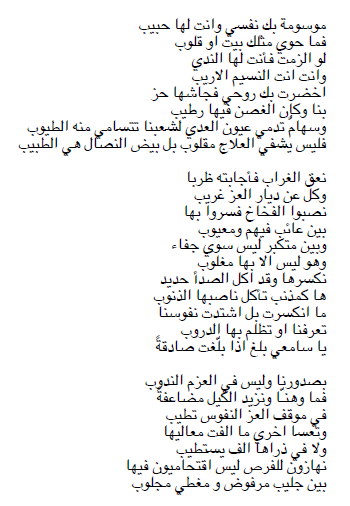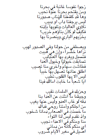 Laat je ziel vrij. Het is mijn zielsverwant en jij de geliefde ervan. Geen huis kon mijn hart zo beschermen als jullie. Was jij dat huis, dan zou je haar dauw zijn, jij bent de rustgevende wind, mijn ziel wordt verkwikt en groen door jou, onze partij bloeit als een tak die weer groen wordt, pijlen doen de ogen van de vijanden bloeden voor ons volk, waaruit parfums opstijgen, maar behandeling geneest niet, integendeel, blinkende witte zwaarden zijn de remedie. De onheilsraaf kraaide en bunzingen antwoordden hem, iedereen is een vreemde van ons roemrijke land. Zij zetten valstrikken op en gingen daarmee op hun nachtelijke reis met degenen bij wie blaam en schande is. En enkel de hoogmoedige met enkel ruwe omgangsvormen wordt door hen overwonnen. Maar we zullen hen breken zoals roest ijzer aanvreet, als een zondaar opgevreten door zijn eigen valstrikken. Onze zielen voelden nimmer zwak, maar zijn sterk geworden, de wegen kennen ons en beschuldigen hen. O toehoorder, als je dit overbrengt, breng het dan waarheidsgetrouw over. In onze harten zijn er geen littekens in onze vastbeslotenheid en niet zwak maar juist twee keer zo standvastig werden wij. In de positie van de roem worden de zielen welriekend en veranderen zij en komen meer overeen met hun grootse daden. Op de toppen ervan zijn er geen duizend die het goede zoeken, mensen die hun kans afwachten, opportunisten, invasieplegers, tussen onaanvaardbaar vreemd en verborgen bedekt. De vijand dwong vreemden in onze zee en wie hen helpt zal gaan weeklagen. Naar die wolven hebben we hier onze borst gekeerd, we zullen niet beven voor de voetstappen van het beest. We zullen de moeilijkste uitdagingen bevechten – hoe zal het ze vergaan onder die druk? – en het terugslaan als God het wil. Hij kiest uit onze kracht, onze harten een laaiend vuur. We zien dat ze groen zijn ook als ze bewegen, zodat ze vallen, en terwijl de nachtegaal over hen zingt wedijverden onze paarden met die van de vijanden. Sommige pijlen missen en andere van ons raken juist doel. Vier hun teugels, door hen hinniken paarden in galop. Alleen daardoor worden de harten welriekend. O volk, jullie hoop in ons zal nooit beschaamd worden. En bij rampen is onze partij de leidende met een leger dat niet wegdook voor onze vijanden, met precisie, die niet weggaat ook al zou de vijand afwezig zijn. Ik offer mijn ziel voor uw belang en onze natie, bloed stroomt immers goedkoop in moeilijke tijden. Als wij naar voren komen, knielen of keren wij niet om. Zowel wij als jullie zijn van adel, superieur ten opzichte van de vijanden, ieder van u zou van mijn bloed kunnen afstammen, van pure komaf, in deze stoffige dagen van alle soorten strijd. |