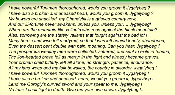Omdat grootmoeder Hohchin haar gehoor is als een wezel maar kan kijken als een hermelijn, heb ik het vege lijf gered. Alleen, met een enkel met een teugel ingehouden paard volgde ik de hertenpaden, van wilgentakken mijn yurt makend beklom ik de berg Burkhan. Op de goddelijke Burkhan Khaldun was mijn leven nietig als een luis, maar ik slaagde te vluchten! mijn leven reddend met dat ene paard. Alleen ging ik over elandenpaden, van twijgen mijn yurt makend, beklom ik de berg Khaldun! Maar op die Khaldun wist ik te overleven, als een zwaluw was ik beschermd! |