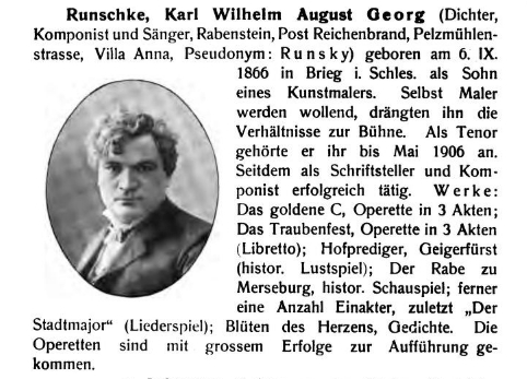 Herdrukt in: Robert Schumann. Genoveva. Oper in 5 Tln . Nach Tieck u. Hebbel / Pordes-Milo en Georg Runsky. Das fatale Ei . Fabelgroteske in 1 Tl. Musik von Walter Schütt. Für d. Rundfunk eingerichtet von Cornelis Bronsgeest. Funk-Dienst, Berlin, 1927. 55p. Sende-Spiele ; Jg. 4, H. 4. Cornelis Bronsgeest (1878-1957) was een Nederlandse, wereldberoemde bariton.http://www.401dutchdivas.nl/nl/baritons/322-cornelis-bronsgeest.html Georg Runsky. Wie bei Kaisers. Volksstück mit Gesang in einem Akt. E. Bloch, Berlin, 1914. 32p. Eduard Blochs Theater-Korrespondenz; Nr. 392. In British Library (BL) en Deutsche Nationalbibliothek (DNb.