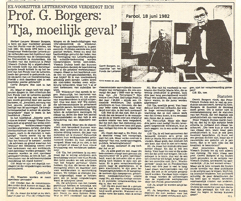 Misschien is het beter om het verhaal écht bij het begin te beginnen, want het Fonds voor de Letteren is altijd omstreden geweest. Zo omstreden, dat alleen al de polemieken die erover gevoerd werden, het povere bedrag dat de Nederlandse overheid jaarlijks voor haar auteurs beschikbaar stelt (dit jaar een kleine vier miljoen) rechtvaardigen. Ger Verrips: 'Er worden altijd meteen de meest krasse termen gebruikt: fraude, nepotisme, vriendjespolitiek. Ik zit echt eens in de twee maanden op het puntje van mijn stoel om weg te lopen. Zo'n bestuursfunctie is toch al frustrerend en zelfs storend voor je eigen schrijfwerk. ' Verrips kan zich daar echt kwaad over maken: "Ik sta niet op het standpunt dat je ieder jaar heel precies een verantwoording moet vragen. Stel dat ze halverwege het jaar door iets heel anders geïnspireerd worden. Mag dat soms niet? (...) Schrijver hebben wel eens inzinkingen, waardoor ze een jaar niet publiceren. Moet je dan hun werkbeurs intrekken en ze naar de bijstand verwijzen?'Verrips: "Vleesch Dubois noemt bij voorbeeld Kossmann, die een tijdlang niets publiceerde. Dat klopt, hij heeft een ernstig auto-ongeluk gehad en toen kwam er van zijn werkplan niets terecht." En of [sic!] the record geeft Verrips nog een aantal voorbeelden waarbij het fonds sociale - inderdaad , het is een schande - sociale factoren mede een rol heeft laten spelen bij de toekenning van een werkbeurs, en niet alleen heeft gekeken of daar de literatuur wel voldoende mee gestimuleerd werd. Of the record, want het mag natuurlijk helemaal niet van CRM.