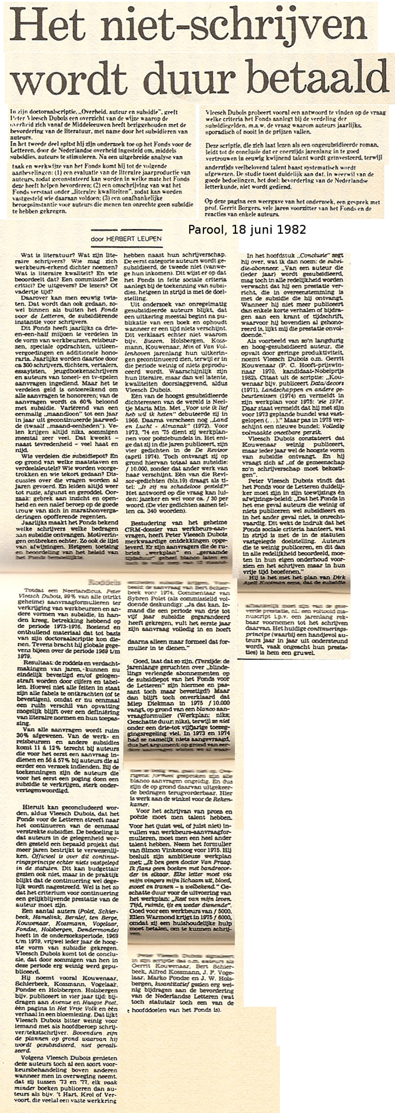 Overigens is de publikatie van een en ander ook niet uit pure objectiviteit gebeurd. De schrijver van het artikel in "Het Parool" was namelijk een dergenen die jaar op jaar bij het Fondsbestuur bot vingen met hun aanvragen. Zo iemand komt natuurlijk heel gemakkelijk tot de overtuiging dat het geld naar de verkeerden gaat. Daarbij zal ook de vraag aan de orde moeten komen of inderdaad de verdeling van dat geld kan worden toevertrouwd aan mensen die zelf allerlei persoonlijke banden met aanvragers hebben. Weliswaar wordt de samenstelling om de twee jaar gedeeltelijk ververst en zit niemand langer dan vijf jaar, maar er kan toch gemakkelijk een soort inteelt optreden. Maar dank zij de socialistische nivelleringspolitiek is deze bron praktisch opgedroogd. In die zin is het logisch dat de staat de ondersteuning van de kunst overneemt. Maar ideaal is het zeker niet. Men hoeft dit element niet voor de volle 100 pet. te ontkennen om toch afstand te nemen van het vrijheidsbegrip dat hierachter ligt. Want in deze zienswijze geeft een mens er pas blijk van echt vrij te zijn, als hij kiest voor de socialistische maatschappij van de toekomst. Maar voor die keuze kan hij evengoed gemanipuleerd worden, bijvoorbeeld door profeten die hem schone dromen voorspiegelen die helemaal niet uitkomen. De consequente marxist gaat zelfs zover, dat hij de mensen pas echt vrij acht als ze alleen nog maar kunnen kiezen wat hij goed voor hen vindt. De conclusie van prof. Van het Reve was, dat een Nederlandse politieke partij en een Nederlandse regering geen oordeel over die keuze van de mensen behoort te hebben en niet op middelen moet zinnen om die te veranderen. Zo kras zouden wij het niet willen formuleren, want dit klinkt ons toch wel al te vrijblijvend in de oren. De overheid zal echter een kunstbeleid moeten voeren binnen de bevoegdheden die haar toekomen, en die zijn slechts bescheiden. Vooral in de niet-politieke sfeer, die van gezin, school en krant, zal de goede smaak voor kunst bevorderd moeten worden en zal geleerd moeten worden ook in deze dingen de geesten te beproeven. Nederlands Dagblad, 07-07-1982 Minister De Boer steunt Fonds voor de letteren (van onze politieke redactie) [fragmenten] DEN HAAG - Er is geen sprake van een geheim CRM-dossier, waaruit zou blijken dat net Fonds voor de Letteren van 1973 tot 1976 een beperkte kring van steeds weer dezelfde schrijvers heeft gesteund. Ook is in die jaren en daarna (op basis van een nieuwe regeling) door het bestuur van het Fonds steeds zorgvuldig en met inachtneming van een zo groot mogelijke objectiviteit gehandeld en beoordeeld. Dit schrijft minister H.A. de Boer (cultuur, recreatie en maatschappelijk werk) in zijn antwoord op schriftelijke vragen van de PvdA-Tweede-Kamerleden A. Kosto en F. Niessen. Minister de Boer ontkent in zijn antwoorden niet, dat schrijvers, die al eerder een werkbeurs kregen, vaker een nieuwe bijdrage krijgen dan eerste aanvragers. Maar hij noemt dat voor de hand liggend, omdat "de kwaliteit bij de groep die al eerder op grond van een kwaliteitsoordeel een uitkering kreeg gemiddeld hoger is dan bij de ongeselecteerde groep eerste aanvragers". (...) Een beslissing wordt alleen genomen op basis van een werkplan, aldus minister De Boer. Bij het niet voltooien van het werkplan hoeft het geld niet te worden teruggestort. Minister De Boer acht dat terecht. (...) (...) De bewindsman heeft inmiddels de Universiteit van Amsterdam om inzage gevraagd van de scriptie van drs. P. Vleesch Dubois over het subsidiebeleid van het Fonds voor de Letteren. Hij wil nakijken of een onlangs in Het Parool verschenen artikel over dit onderzoek wel klopt. De minister schrijft de faculteit, dat hij een eventuele weigering om de scriptie op te sturen, hoog op zal nemen. Bron: http://resolver.kb.nl/resolve?urn=ddd:010627807:mpeg21:a0073