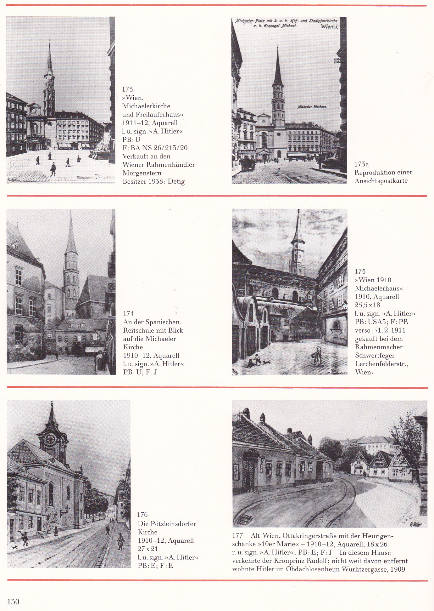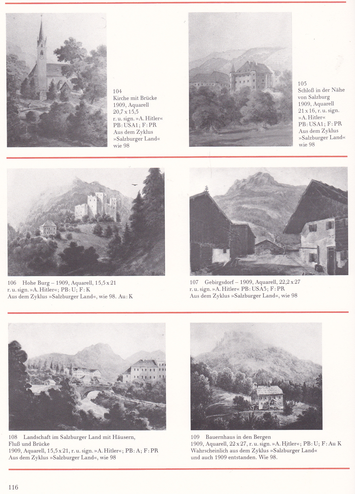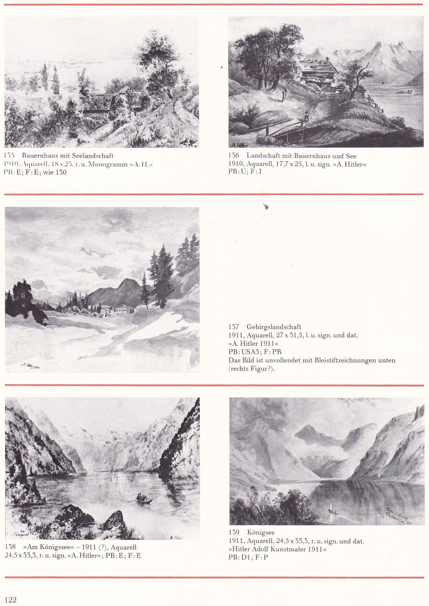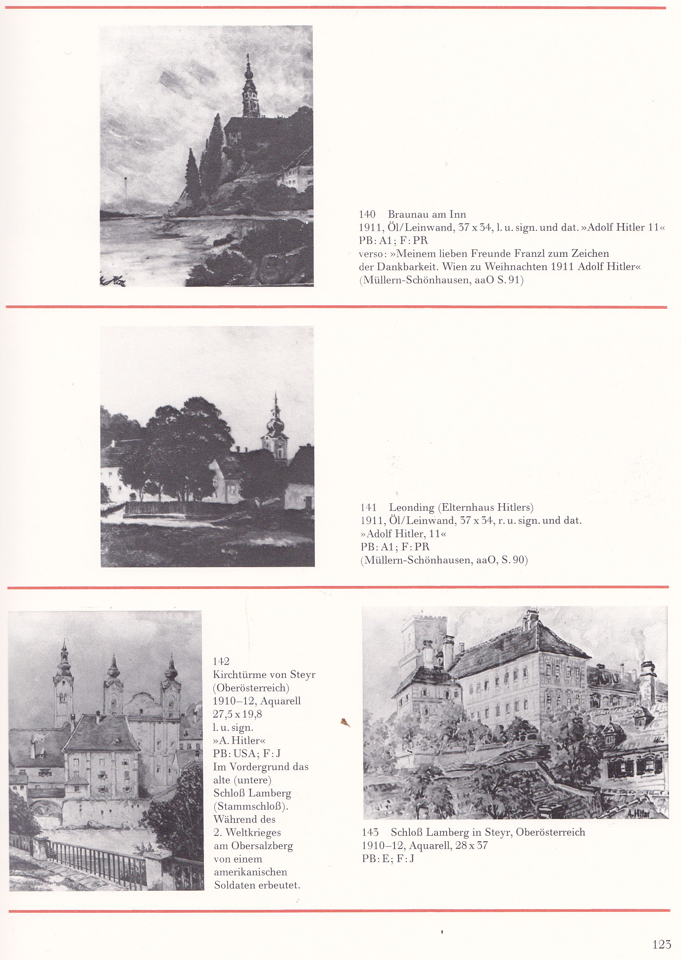 ![]() Every item from the collection (Sammlung] A1 is a forgery - see Dr. Johannes von Müllern-Schönhausen. Every item from the collection USA2 is forged by Konrad Kujau. Numbers with codes 'PB. D1, F: PR' are very likely to be forgeries by Kujau. Everything signed with 'A.H.' or 'Adolf Hitler' is a forgery. Everything from J (Peter Jahn) is highly suspect Everything from S is highly suspect Everything from K is highly suspect Everything from D1 (Stiefel, Stuttgart) is highly suspect Everything from D2 (Speer) is highly suspect All World War 1 watercolors not depicted in Hoffmann’s book Adolf Hitler / Aquarelle (1935) are highly suspect and should be considered as forgeries All watercolors / oilpaintings from 1918 or later are forgeries All portraits and nudes are forgeries Everything with many people on it is highly suspect According to Volker Ullrich (Adolf Hitler. Biographie, 2013 page 62) Hitler made at least three oilpaintings which he sold to Dr. Hans Schirmer in München, late 1913/begin 1914. If Ullrich is correct on this, these are the only three documented oil paintings by Hitler.' In Price the numbers 342, 343 and 344 are presented as these works. It is not known if the depicted works are authentic or forgeries. top of page Page 116, numbers 104-107 (all forgeries) ![]() top of page Page 117, numbers 108-114 (all forgeries) ![]() top of page Page 118, numbers 115-119 (all forgeries) ![]() top of page Page 119, numbers 120-123 (all forgeries) ![]() top of page Page 120, numbers 124-129 (all forgeries) ![]() top of page Page 121, numbers 130-134 (all forgeries) ![]() top of page Page 122, numbers 135-139 (all forgeries) ![]() top of page Page 123, numbers 140-143 (all forgeries) ![]() top of page Page 124, numbers 144-148 (all forgeries) ![]() top of page Page 125, numbers 149-153 (all forgeries) ![]() top of page Page 126, numbers 154-157 (all forgeries) ![]() top of page Page 127, numbers 158-161 (all forgeries) ![]() top of page Page 128, numbers 162-166 (all forgeries) ![]() top of page Page 129, numbers 167-172 (all forgeries, except 170 - possibly authentic) ![]() top of page Page 130, numbers 173-177 (all forgeries) ![]() top of page Page 131, numbers 178-181 (all forgeries) ![]() top of page Page 132, numbers 182-184 (all obvious forgeries, except 184: possibly authentic) ![]() top of page Page 133, numbers 185-188 (all obvious forgeries) With these works the most logical explanation is that the forgers found a postcard, copied it and attributed these copies to Hitler, whilst Peter Jahn 'authenticated' these copies by his making up a story that Hitler himself told him that his paintings of the 'Minoritenkirche' sold very well (Price 188a). The provenance ('Albert Speer') of Price 188 fits the swindlers' story. ![]() top of page Page 134, numbers 189-192 (all obvious forgeries; except 190 - possibly authentic) The over the top provenance history with Price 192 is typical swindler's talk. ![]() top of page Page 135, numbers 193-198 (all obvious forgeries) ![]() top of page Page 136, numbers 199-200 (all obvious forgeries) Comment at 200A: Dr. Heinrich Fuchs was one of the 'certificate of authenticity' swindlers active in the Hitler forgery industry, in the 1970's. ![]() top of page |
