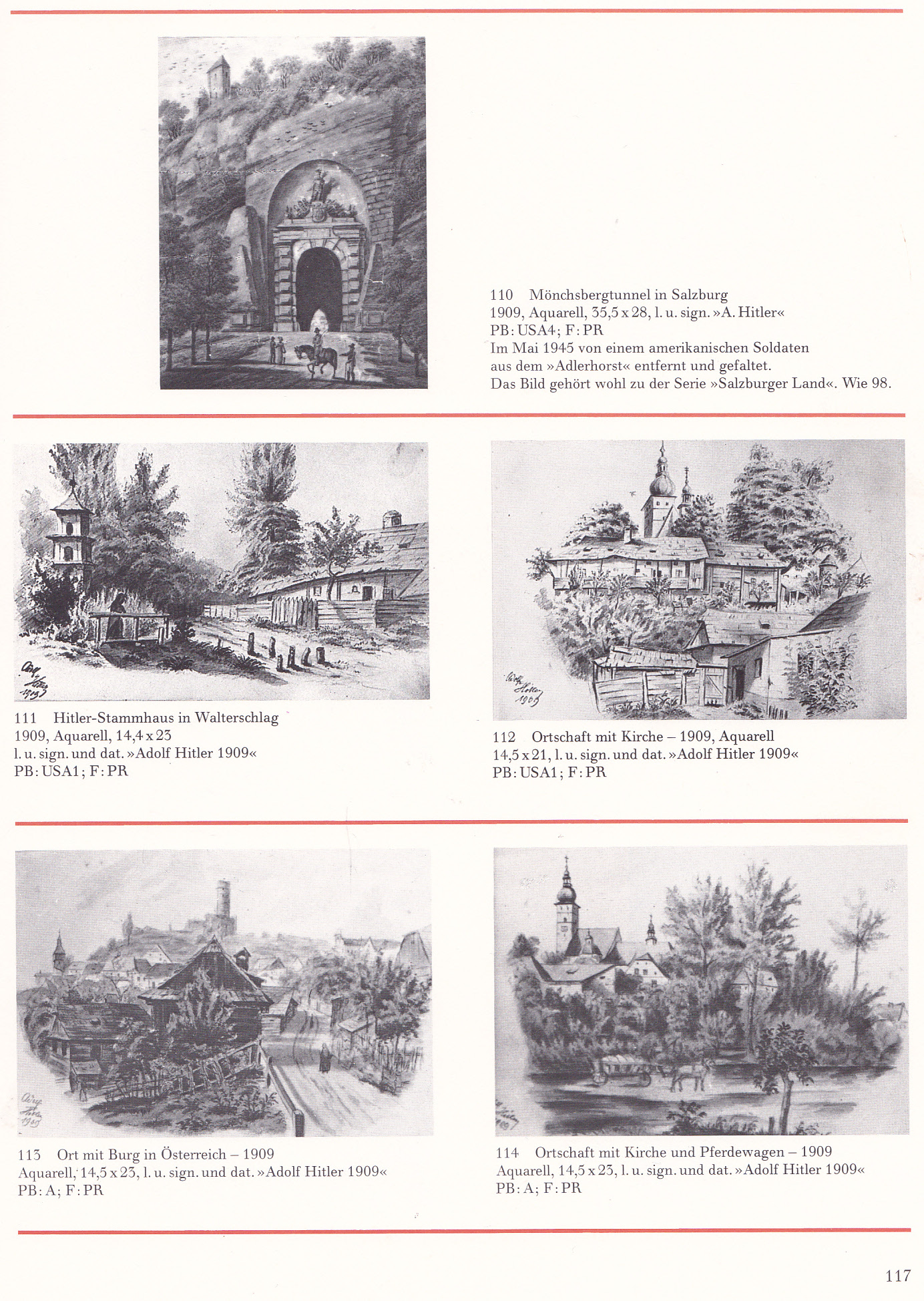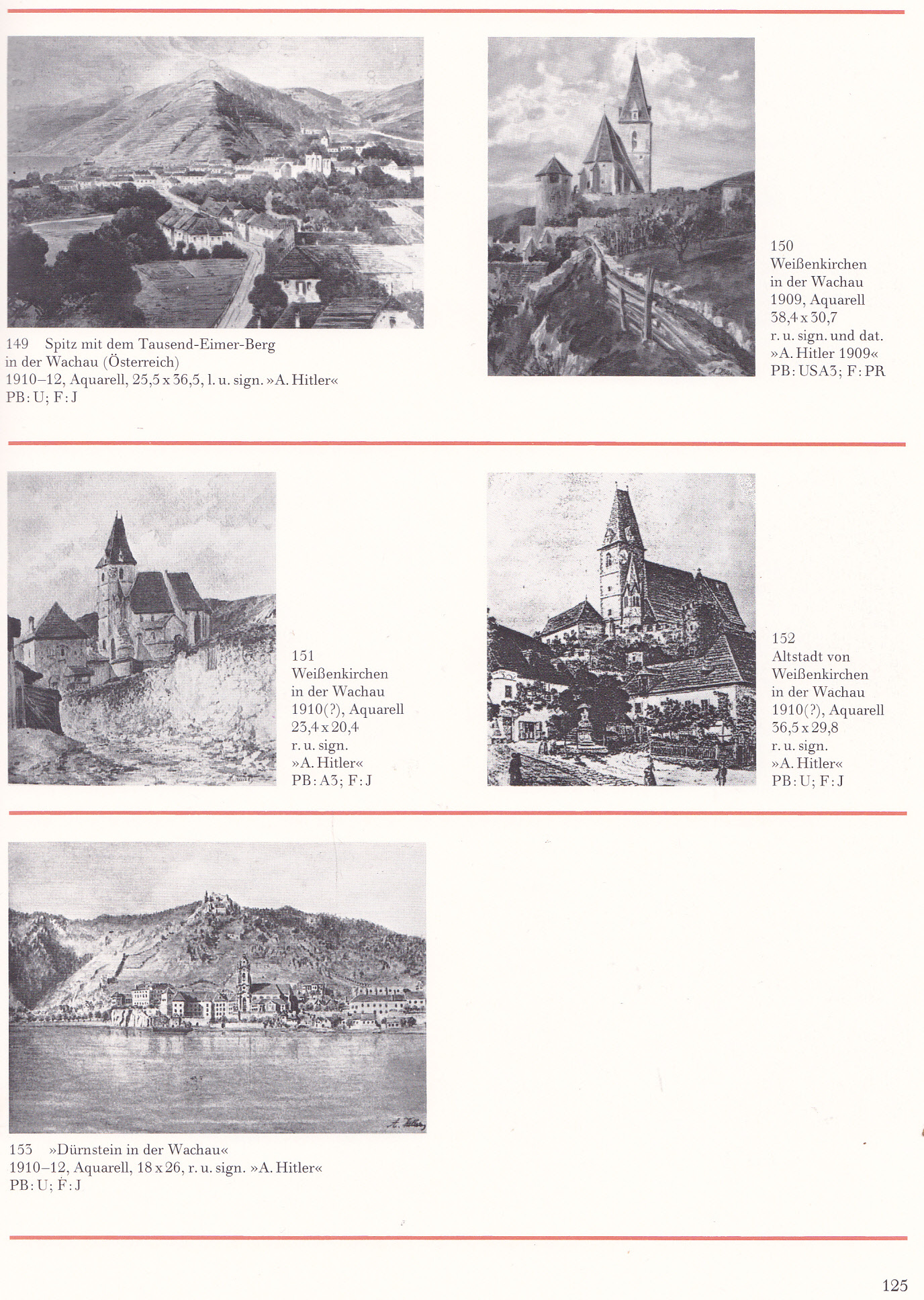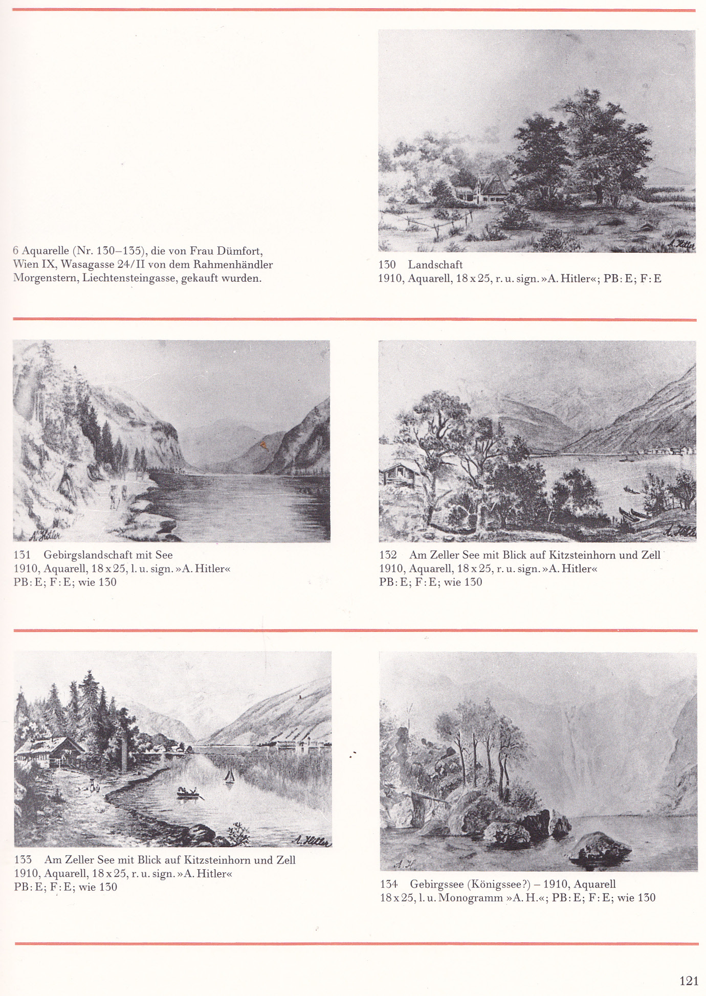 ![]() Every item from the collection (Sammlung] A1 is a forgery - see Dr. Johannes von Müllern-Schönhausen. Every item from the collection USA2 is forged by Konrad Kujau. Numbers with codes 'PB. D1, F: PR' are very likely to be forgeries by Kujau. Everything signed with 'A.H.' or 'Adolf Hitler' is a forgery. Everything from J (Peter Jahn) is highly suspect Everything from S is highly suspect Everything from K is highly suspect Everything from D1 (Stiefel, Stuttgart) is highly suspect Everything from D2 (Speer) is highly suspect All World War 1 watercolors not depicted in Hoffmann’s book Adolf Hitler / Aquarelle (1935) are highly suspect and should be considered as forgeries All watercolors / oilpaintings from 1918 or later are forgeries All portraits and nudes are forgeries Everything with many people on it is highly suspect According to Volker Ullrich (Adolf Hitler. Biographie, 2013 page 62) Hitler made at least three oilpaintings which he sold to Dr. Hans Schirmer in München, late 1913/begin 1914. If Ullrich is correct on this, these are the only three documented oil paintings by Hitler.' In Price the numbers 342, 343 and 344 are presented as these works. It is not known if the depicted works are authentic or forgeries. top of page Page 116, numbers 104-107 (all forgeries) ![]() top of page Page 117, numbers 108-114 (all forgeries) ![]() top of page Page 118, numbers 115-119 (all forgeries) ![]() top of page Page 119, numbers 120-123 (all forgeries) ![]() top of page Page 120, numbers 124-129 (all forgeries) ![]() top of page Page 121, numbers 130-134 (all forgeries) ![]() top of page Page 122, numbers 135-139 (all forgeries) ![]() top of page Page 123, numbers 140-143 (all forgeries) ![]() top of page Page 124, numbers 144-148 (all forgeries) ![]() top of page Page 125, numbers 149-153 (all forgeries) ![]() top of page Page 126, numbers 154-157 (all forgeries) ![]() top of page Page 127, numbers 158-161 (all forgeries) ![]() top of page Page 128, numbers 162-166 (all forgeries) ![]() top of page Page 129, numbers 167-172 (all forgeries, except 170 - possibly authentic) ![]() top of page Page 130, numbers 173-177 (all forgeries) ![]() top of page Page 131, numbers 178-181 (all forgeries) ![]() top of page Page 132, numbers 182-184 (all obvious forgeries, except 184: possibly authentic) ![]() top of page Page 133, numbers 185-188 (all obvious forgeries) With these works the most logical explanation is that the forgers found a postcard, copied it and attributed these copies to Hitler, whilst Peter Jahn 'authenticated' these copies by his making up a story that Hitler himself told him that his paintings of the 'Minoritenkirche' sold very well (Price 188a). The provenance ('Albert Speer') of Price 188 fits the swindlers' story. ![]() top of page Page 134, numbers 189-192 (all obvious forgeries; except 190 - possibly authentic) The over the top provenance history with Price 192 is typical swindler's talk. ![]() top of page Page 135, numbers 193-198 (all obvious forgeries) ![]() top of page Page 136, numbers 199-200 (all obvious forgeries) Comment at 200A: Dr. Heinrich Fuchs was one of the 'certificate of authenticity' swindlers active in the Hitler forgery industry, in the 1970's. ![]() top of page |