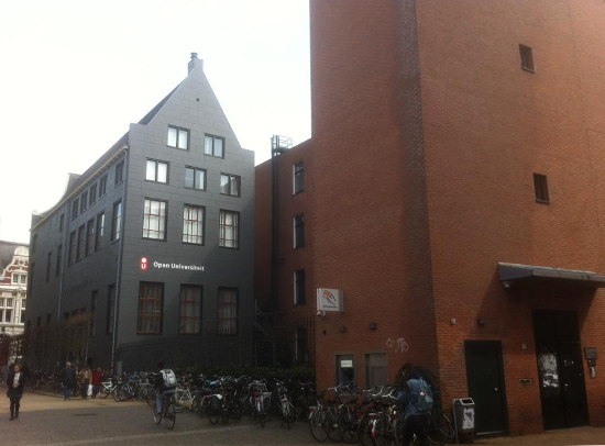 Voormalig WNC, gezien vanaf het Broerplein. Het grijze gebouw aan de linkerzijde is Oude Boteringestraat 24, het zogeheten Calmershuis. De deuren aan de rechterzijde bevinden zich in de Poststraat. Tussen het Calmershuis en het rode bakstenengedeelte rechts bevond zich het pand waar Marco op vrijdagmorgen 20 april 1990 om 06.00 uur Karin P. en Satan in een logeerruimte aantrof. |